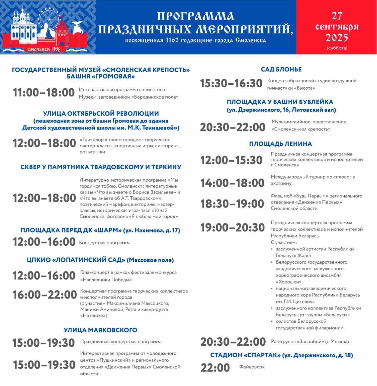 Праздничная неделя завершится концертом рок-группы "Зверобой" 27 сентября в 20:30. В 22:00 небо Смоленска озарят залпы салюта.