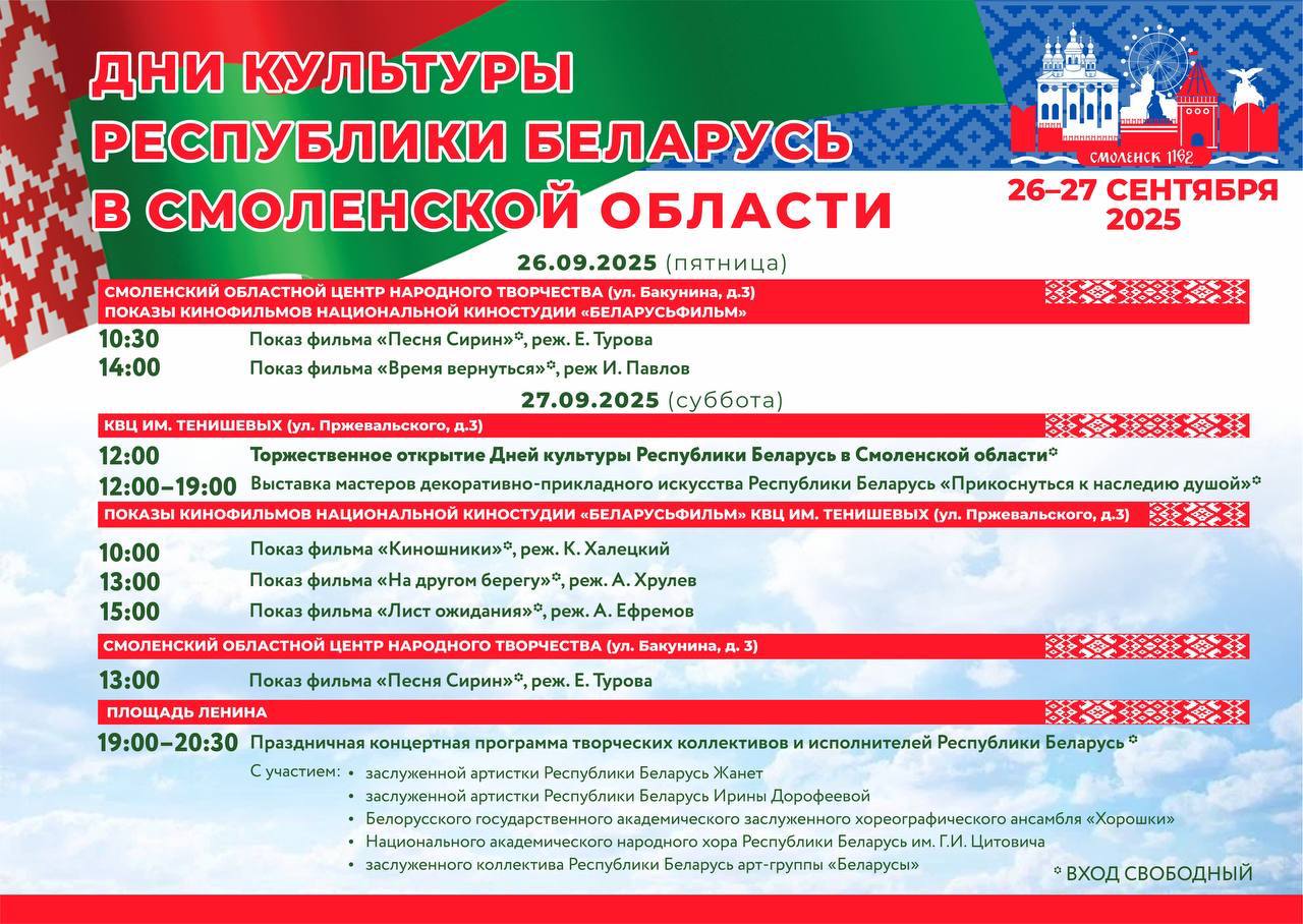 С 26 по 27 сентября в Смоленске пройдут Дни культуры Республики Беларусь. Акция напомнит о дружбе наших народов, общей истории и ценностях. Смолян и гостей города ждут кинопоказы сразу на трех площадках, а также праздничная программа с участием заслуженных белорусских артистов.