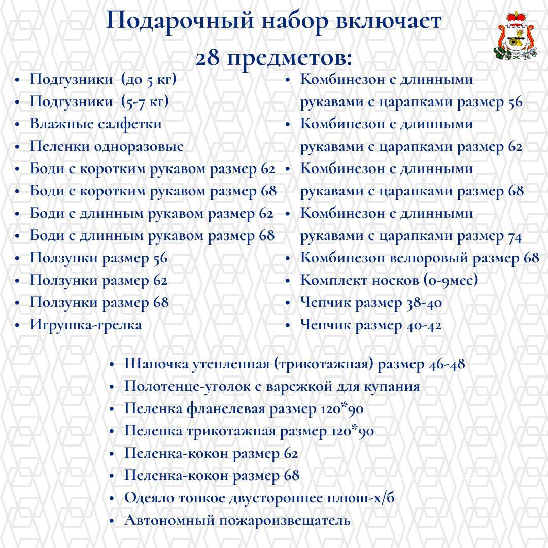 Набор включает 28 предметов первой необходимости: от подгузников до комбинезонов и носочков. Мера поддержки доступна семьям, зарегистрированным на территории Смоленской области, где в период с 1 января 2025 года родился ребенок. Подробнее об условиях смотрите в карточках.